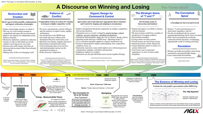 By using a timeline approach, The “Gouge” on John Boyd’s OODA loop is intended to visualize what is behind Boyd’s back-of-the-napkin, non-linear decision-making framework. For example, as you look at the timeline you may notice that A Discourse on Winning and Losing (The “Green Book”), which includes The Essence of Winning and Losing (1995), took nearly 20 years to complete and around 15 hours to brief. Think about that the next time you see the OODA loop drawn as a single loop.